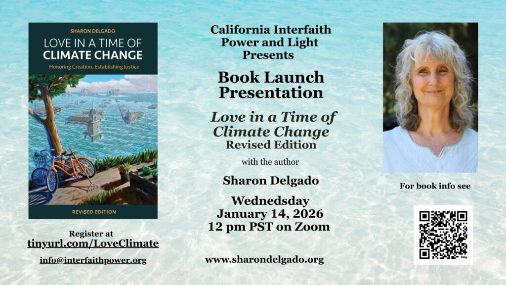 California Interfaith Power and Light will present an online Book Launch Presentation with Sharon Delgado on Wednesday, January 14 at 12 noon PST, to celebrate the launch of the Revised Edition of her book, Love in a Time of Climate Change: Honoring Creation, Establishing Justice. In this book, the author guides readers on a faith journey inspired by love of God and neighbor that equips them to respond to the climate emergency. By using scripture, tradition, reason, and experience to explore the themes of creation and justice, she helps readers assess the realities and implications of climate change and to discern a response that includes honoring creation and stablishing justice in our time. The book has been endorsed by climate activists, scientists, and theologians.