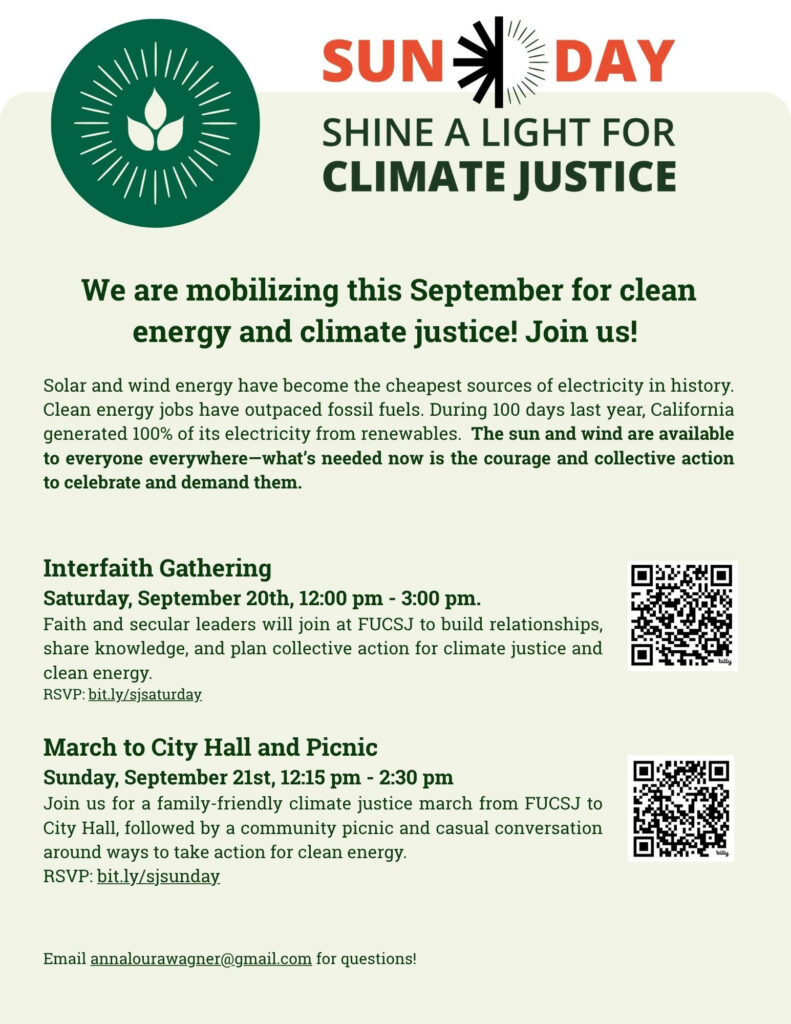 The San Jose community is joining together to call for climate justice and clean energy. As people of faith and spirit, we know that caring for creation and protecting our communities from the harms of fossil fuels is both a moral calling and an urgent necessity. This September, the San José community will come together, as part of a national weekend of climate mobilization, for two powerful opportunities to stand for climate justice and clean energy.